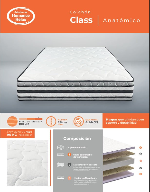 Disfruta de un descanso pleno con el Colchón Class Anatómico de Romance Relax, diseñado para ofrecer firmeza, soporte y comodidad en cada noche. Su estructura de 5 capas equilibra resistencia y confort, adaptándose a la forma natural del cuerpo para un descanso más saludable y reparador.