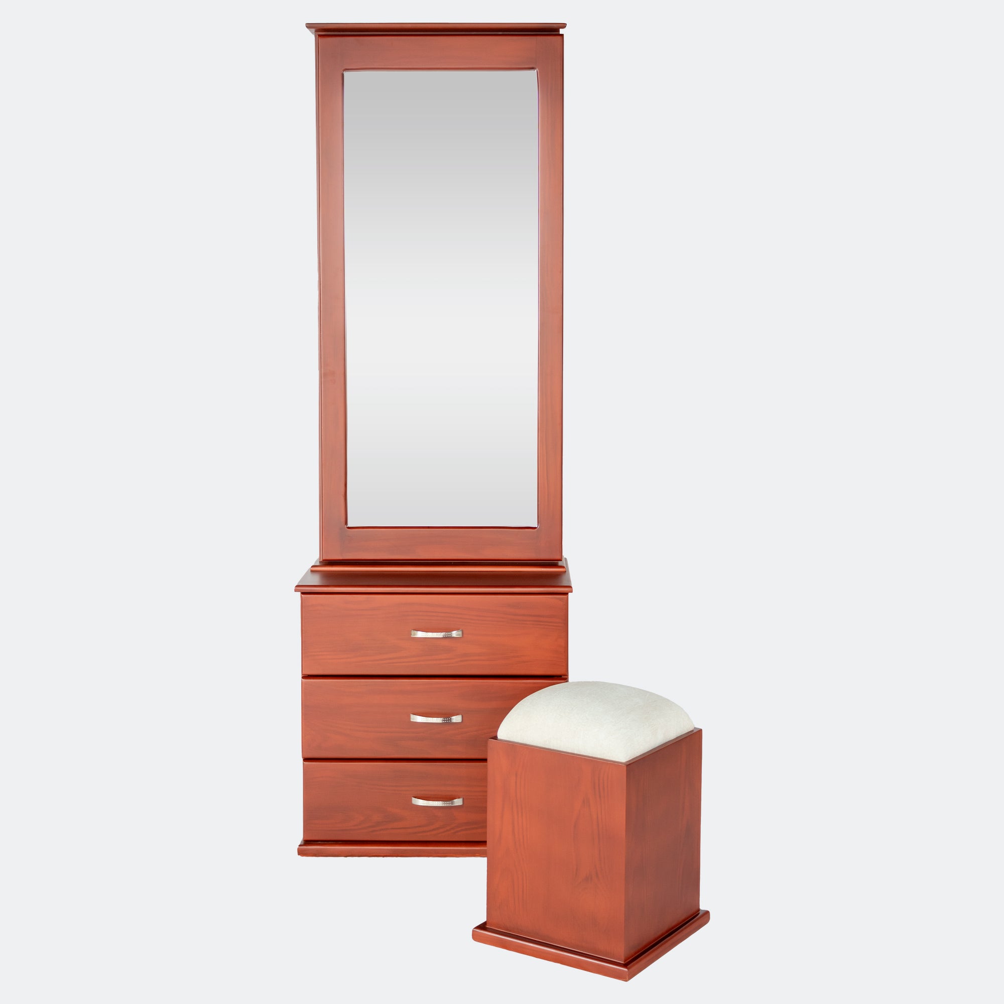 Fabricado completamente por nuestros artesanos colombianos, el tocador incluye un butaco zapatero en colores elegantes y llamativos, que complementan su estilo único.