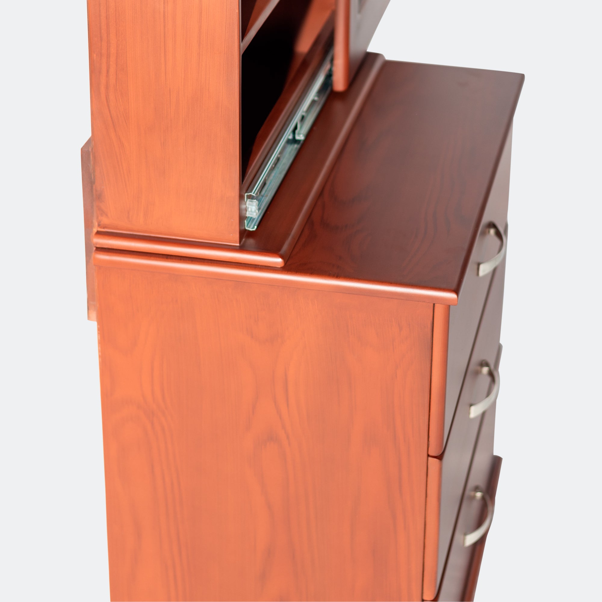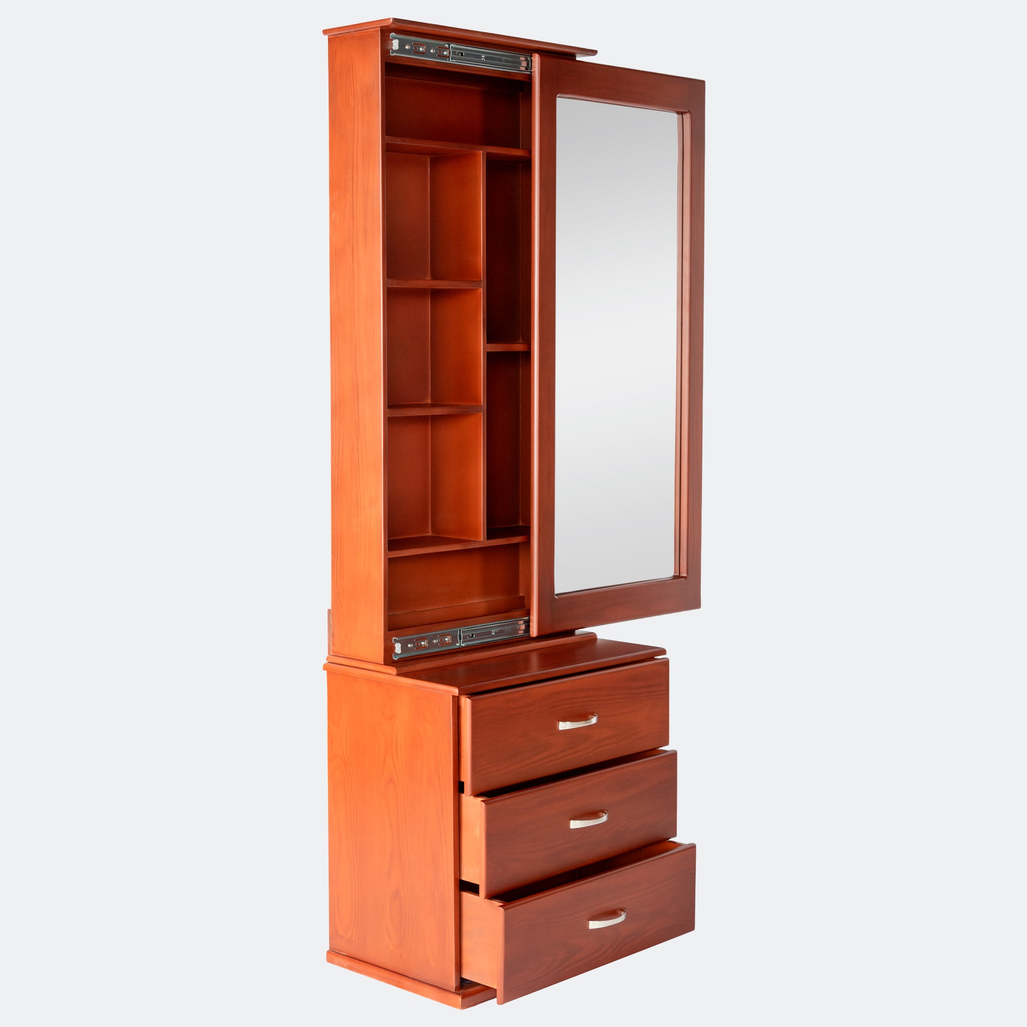 Este elegante tocador corredizo, elaborado con maderas de alta calidad, presenta una estructura en madera nogal y entrepaños en madera pizano, 100% inmunizado para adaptarse a cualquier tipo de clima.