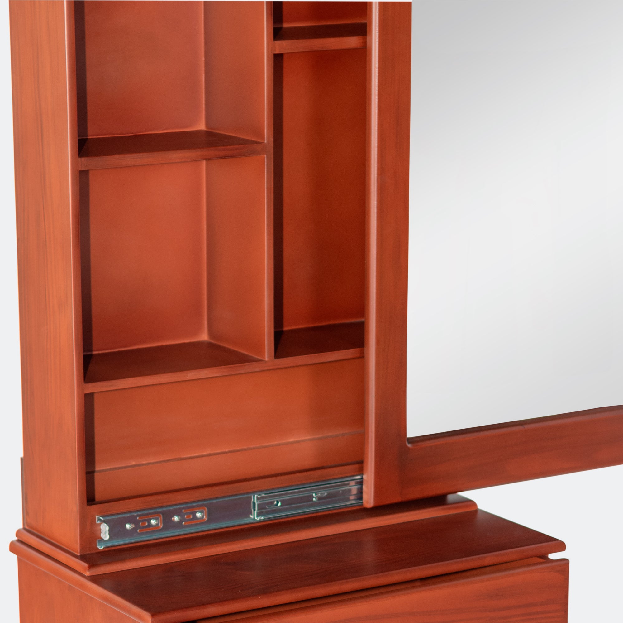 Además de su diseño sofisticado, cuenta con un espejo corredizo que, al abrirse, revela espacios versátiles para guardar decoración o materiales personales, ofreciendo máxima funcionalidad y organización.